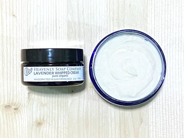 Our organic Whipped Cream is such a good moisturizer you'll want to use it on everything (we don't recommend strawberries)! Just the smallest smidgen will amply return the moisture to an entire area. Exclusive Meadowfoam Seed oil is so light to the touch, mixed with ultra-whipped shea, Heavenly Soap Company's organic Whipping Cream will no doubtedly be your favorite daily moisturizer. BASIC INFORMATION OF OUR SOAP All Organic Vegan Oil Base No Palm No Animal Test Eco-Friendly Handmade WEIGHT: 2 oz. (60g) / 4 oz. (120g) INGREDIENTS: Organic Refined Shea Butter, Organic Argan Oil, Organic Jojoba Oil, Organic Coconut Oil, Organic Castor Oil, Organic Avocado Oil, Vitamin E