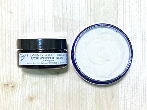 Our organic Whipped Cream is such a good moisturizer you'll want to use it on everything (we don't recommend strawberries)! Just the smallest smidgen will amply return the moisture to an entire area. Exclusive Meadowfoam Seed oil is so light to the touch, mixed with ultra-whipped shea, Heavenly Soap Company's organic Whipping Cream will no doubtedly be your favorite daily moisturizer. BASIC INFORMATION OF OUR SOAP All Organic Vegan Oil Base No Palm No Animal Test Eco-Friendly Handmade WEIGHT: 2 oz. (60g) / 4 oz. (120g) INGREDIENTS: Organic Refined Shea Butter, Organic Argan Oil, Organic Jojoba Oil, Organic Coconut Oil, Organic Castor Oil, Organic Avocado Oil, Rose Absolute, Vitamin E